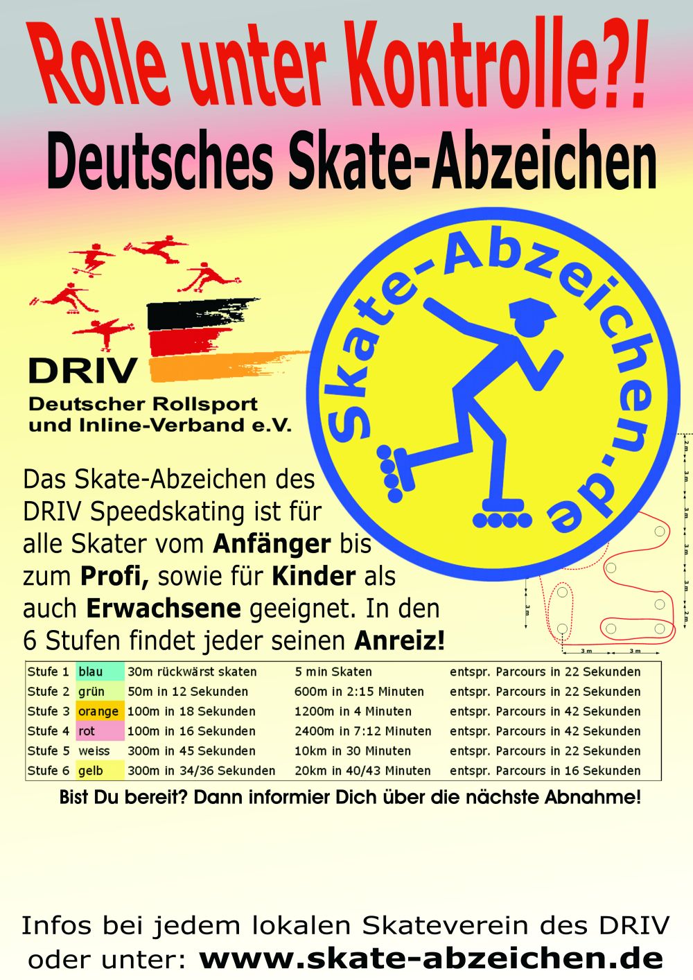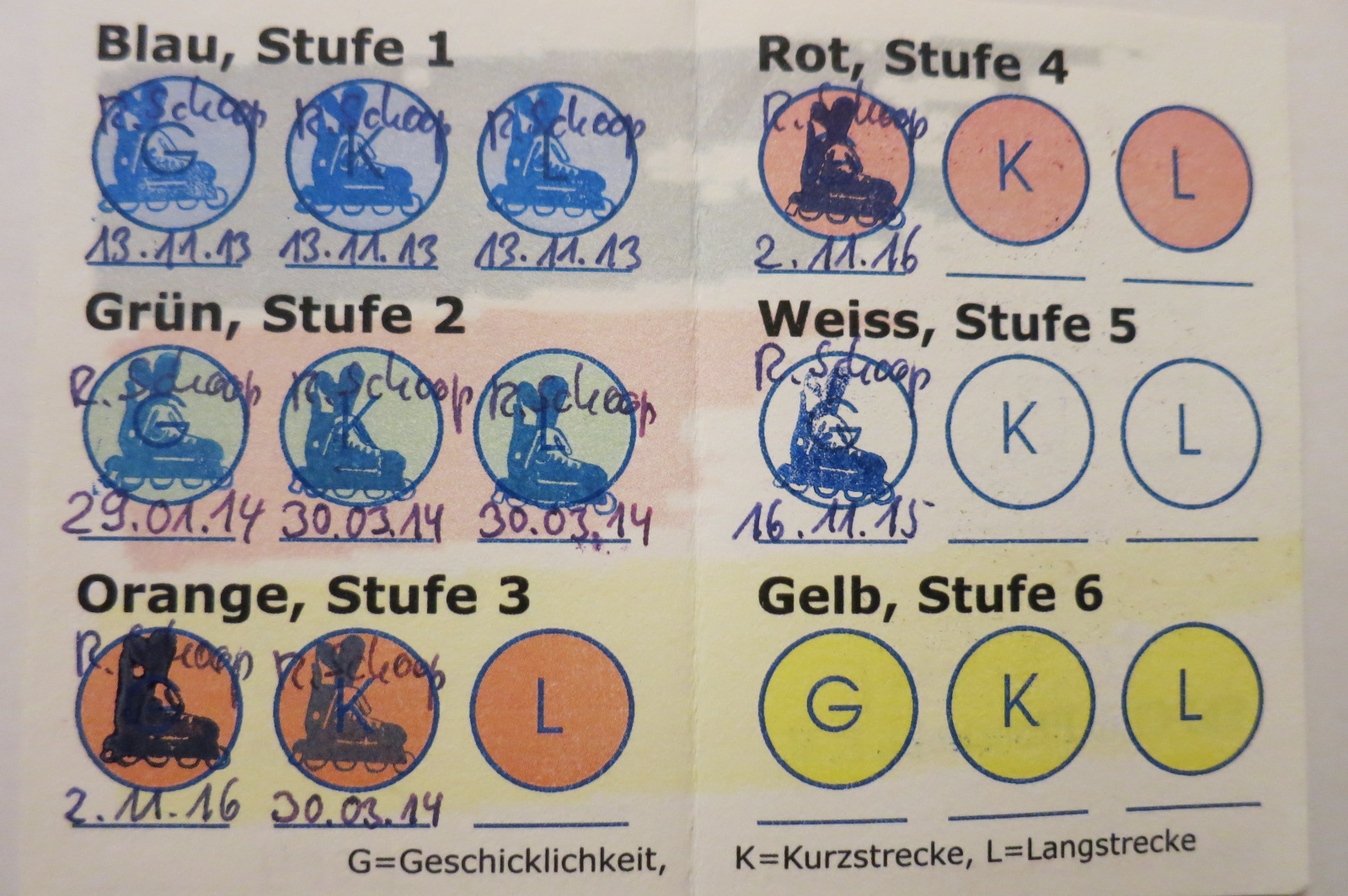 Jedes Jahr kamen ca. 50 neue Teilnehmer im Alter zwischen 6 und 60 Jahren dazu. Die Jüngsten freuen sich über das Abzeichen Stufe 1 in Blau, bei dem auch schon eine Strecke rückwärts geskatet werden muß. Die etwas Älteren schaffen dann auch schon das Abzeichen Stufe 2 oder sogar Stufe 3. Immer gilt es, einen Geschicklichkeitsparcours, eine Kurz- und eine Langstrecke in einer vorgegebenen Maximalzeit zu bewältigen.